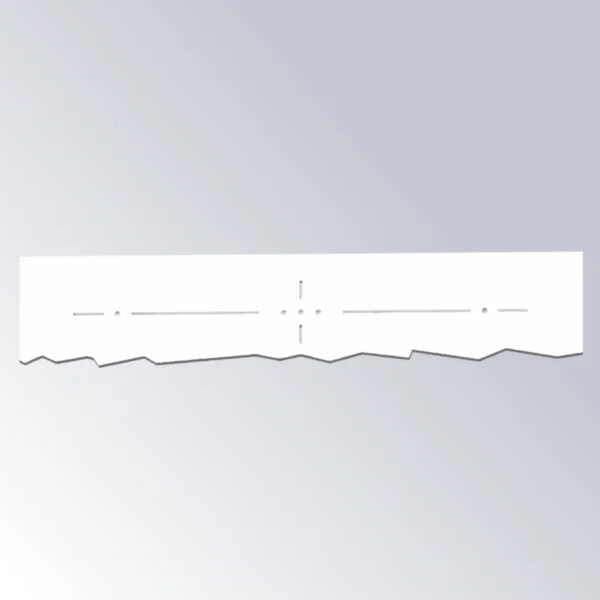 Lambrequin ajouré avec une ligne centrale discontinue et une découpe en frise irrégulière. Modèle sobre, teinté des codes plutôt classiques mais qui casse les codes par son asymétrie.